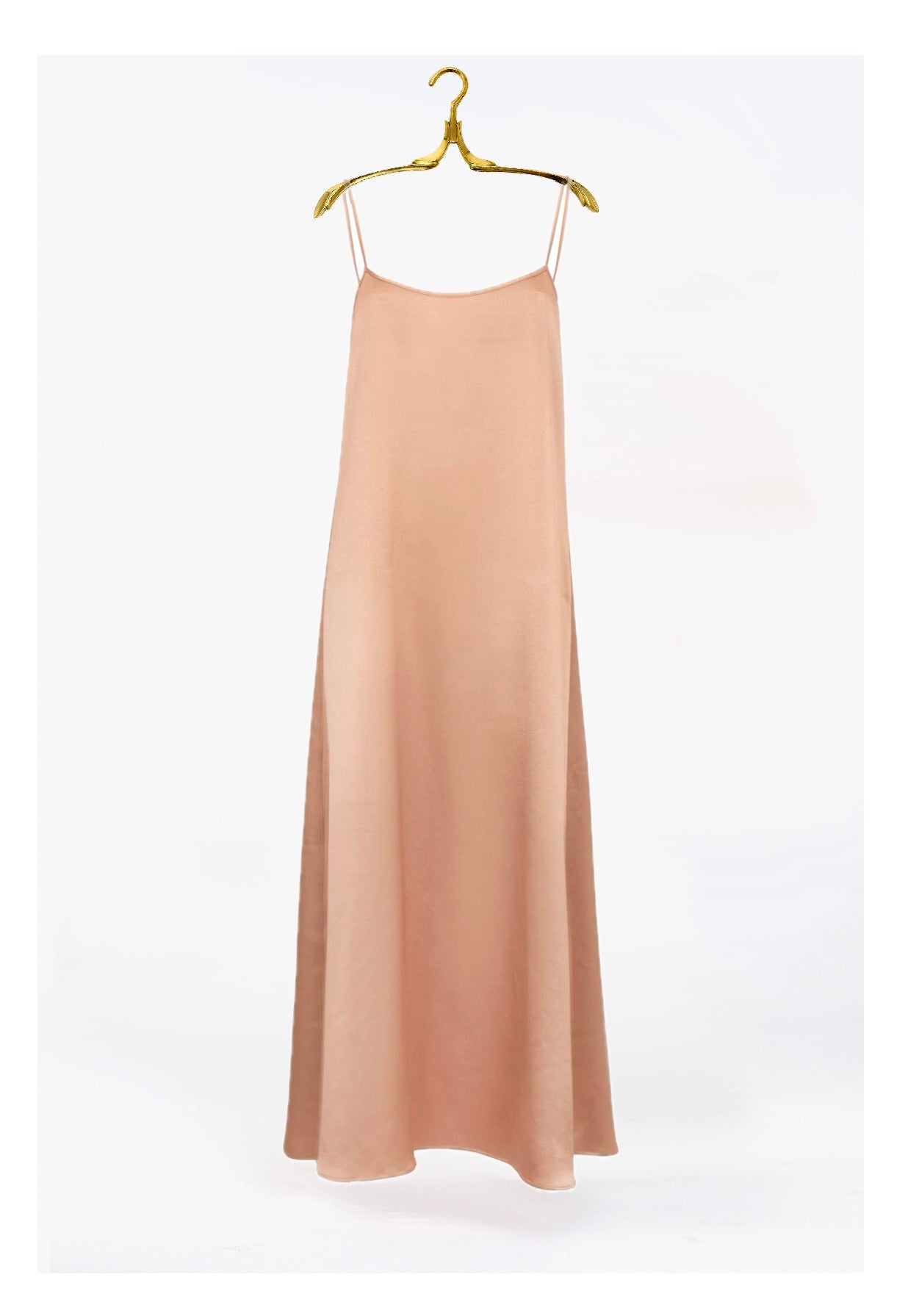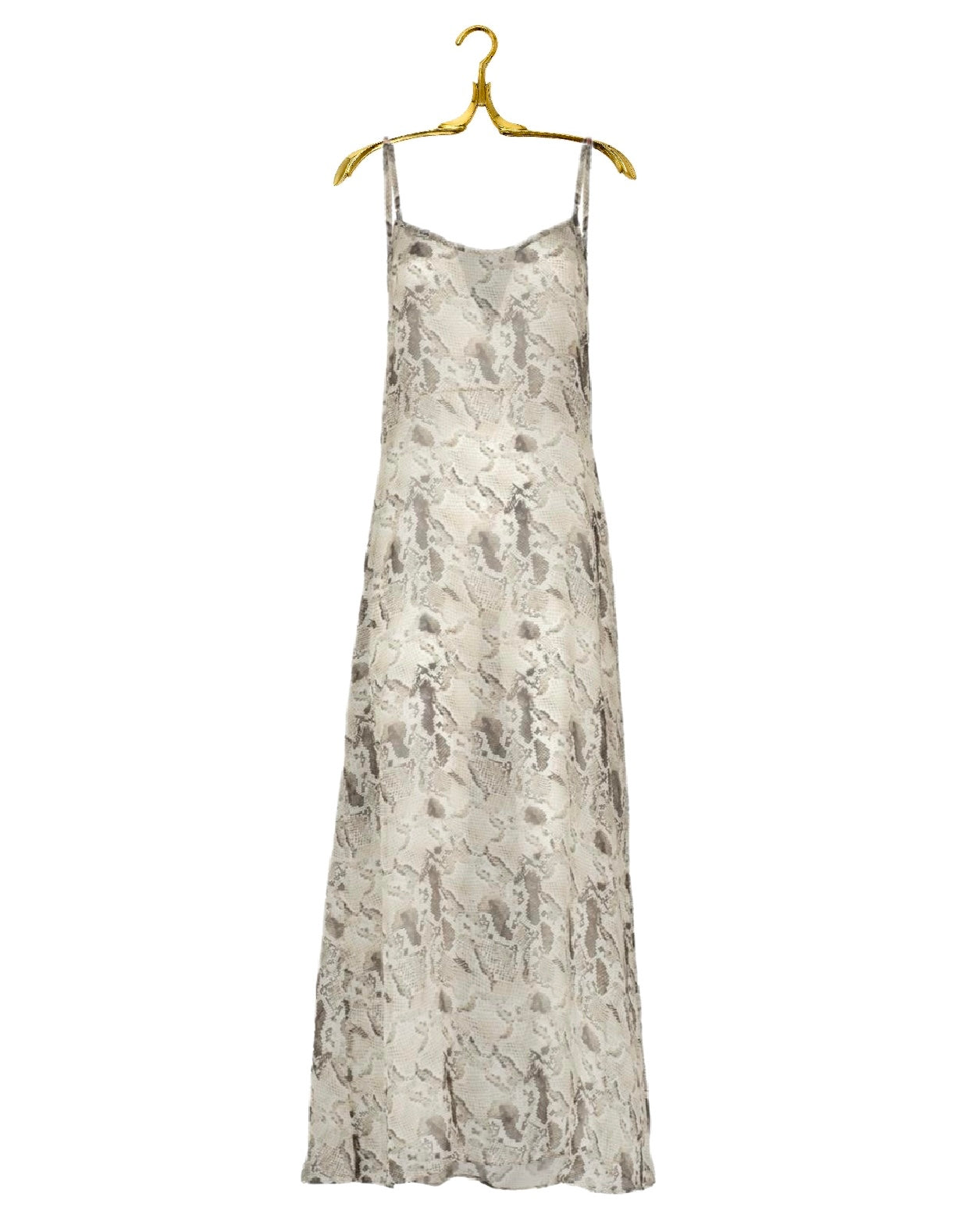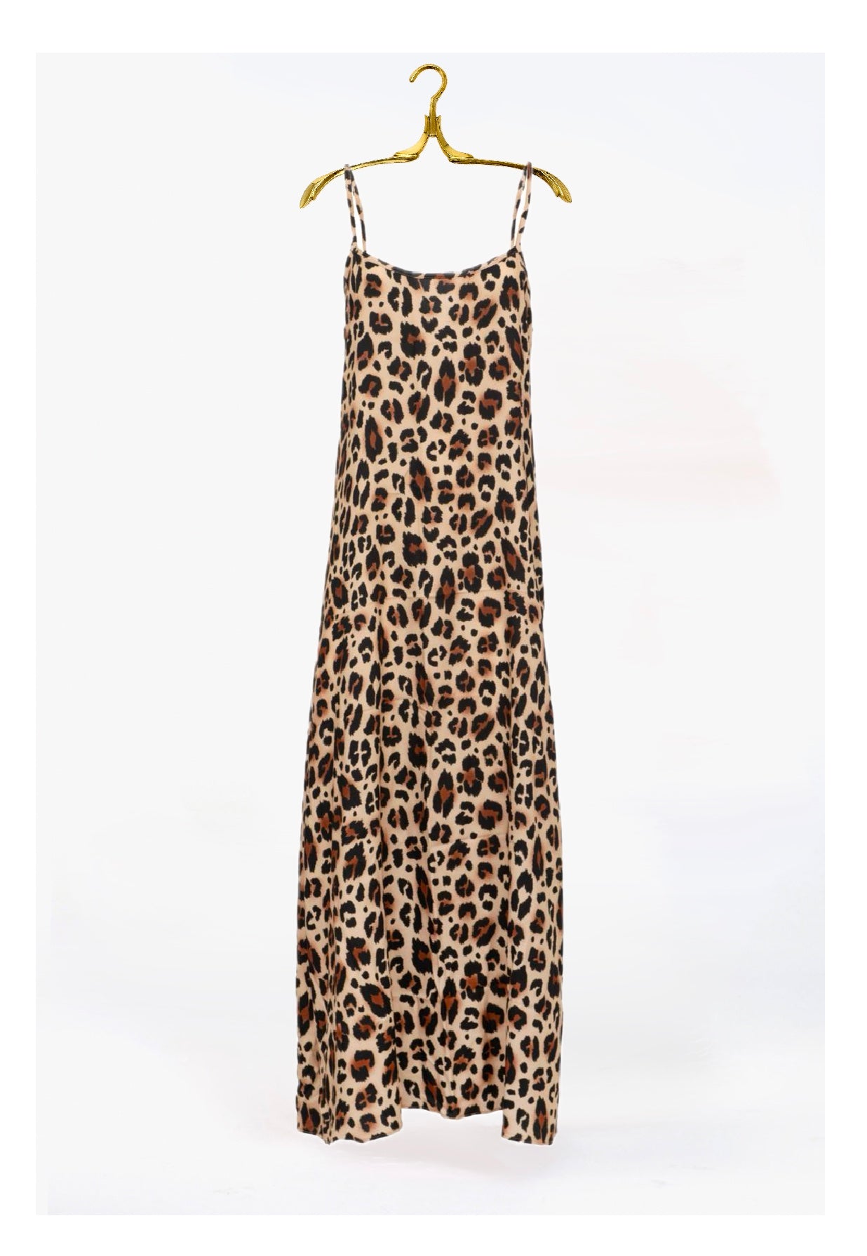 Abito midi con spalline sottili realizzato al 100% in viscosa maculata tagliato e cucito a mano, confezionato in Italia con tessuto 100% Made in Italy.