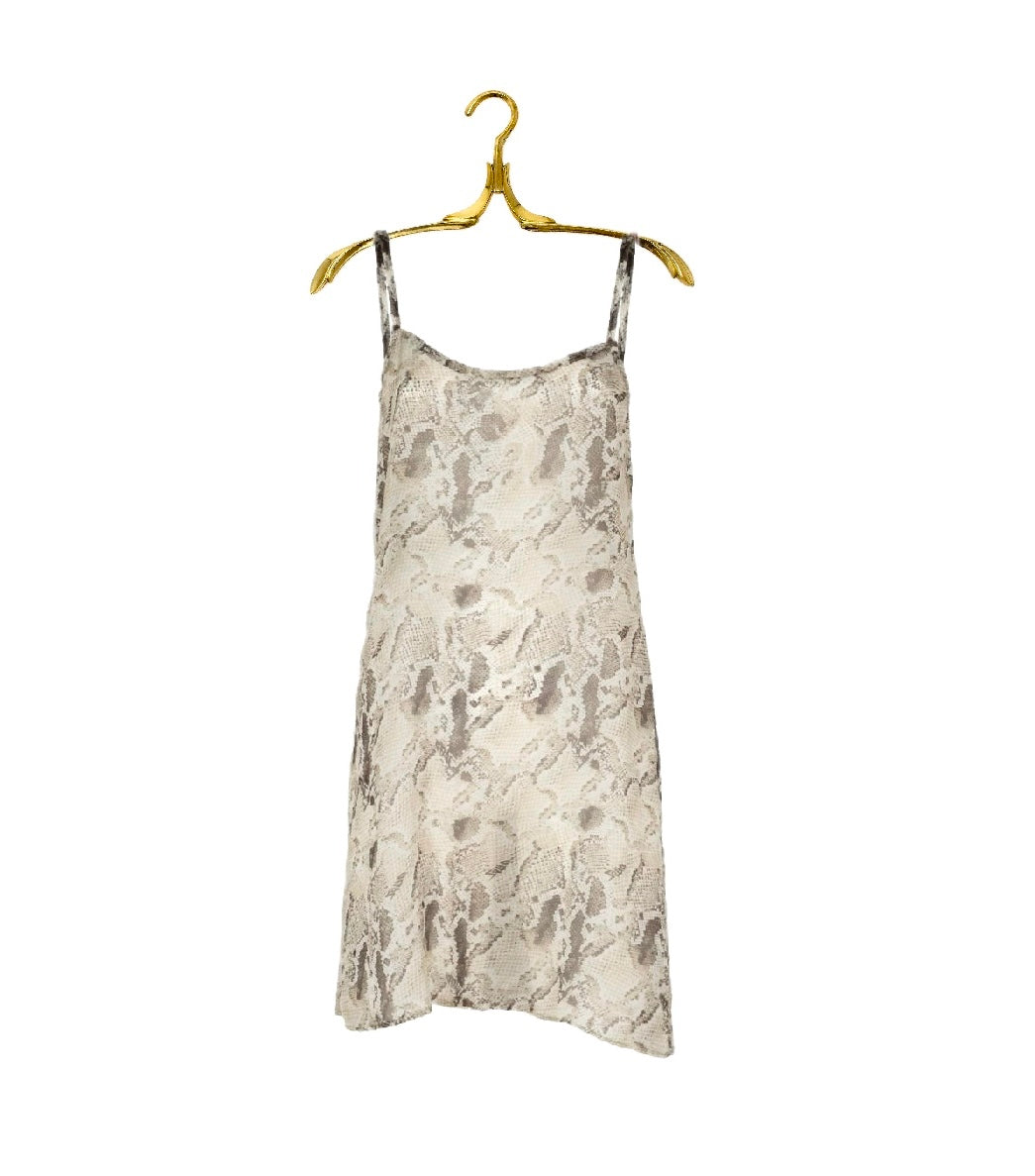 Abito con spalline sottili realizzato al 100% in viscosa maculata tagliato e cucito a mano, confezionato in Italia con tessuto 100% Made in Italy.
